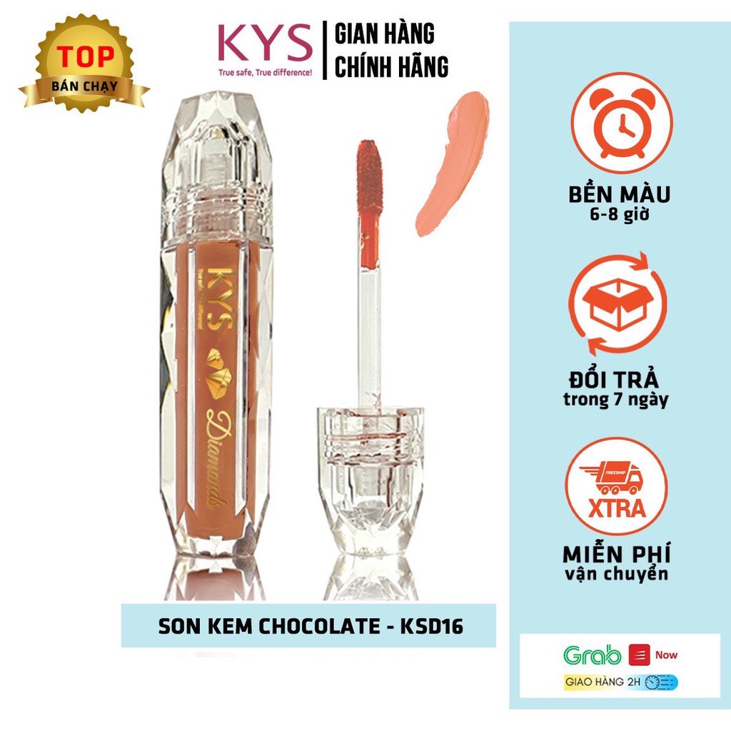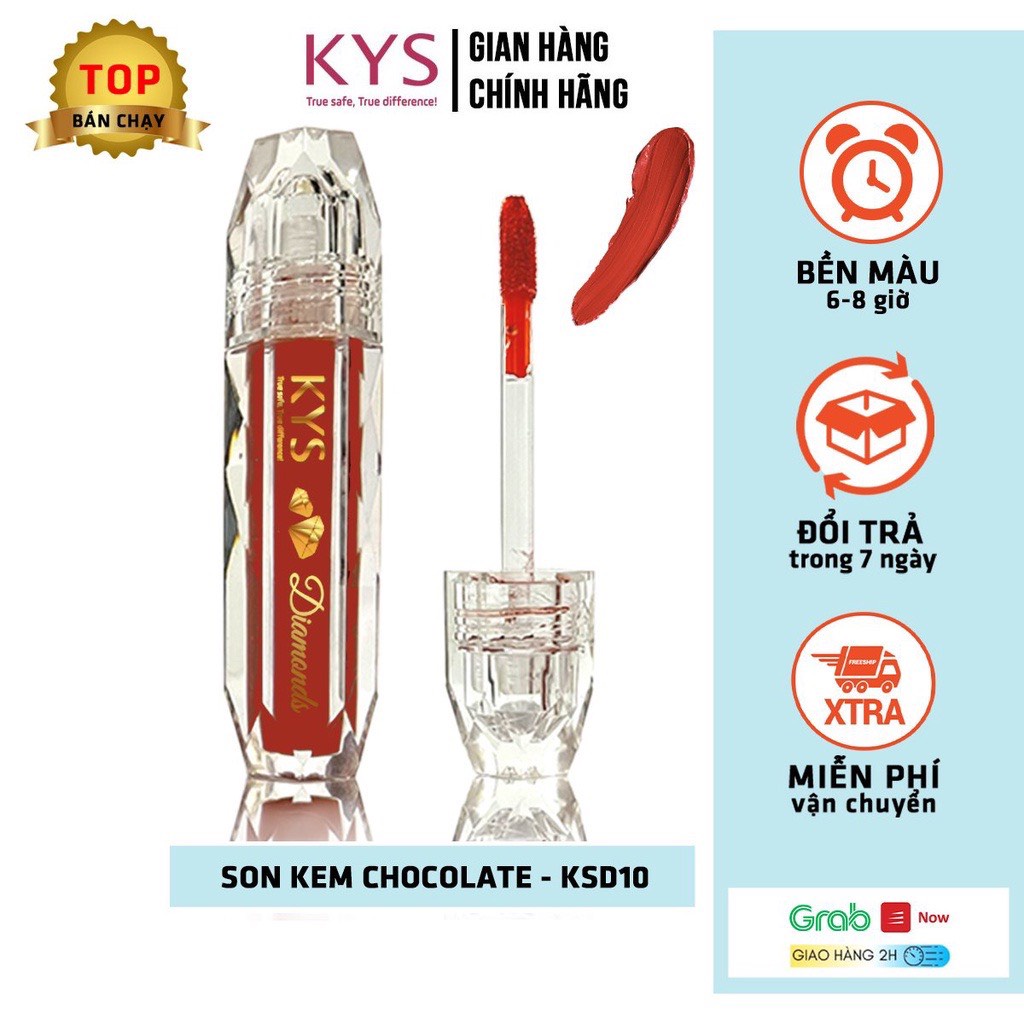 Son thỏi lì không chì lâu trôi Chocolate KYS Cam Cháy: Sản phẩm son đầu tiên trên thị trường được tạo nên từ 92% chocolate đen nguyên chất tinh luyện cùng thành phần tự nhiên an toàn không chứa chì, không gây thâm môi cùng chất son mềm nhẹ mướt môi, dễ đánh, không lộ vân môi. Màu lên chuẩn ngay từ lần tô đầu tiên.