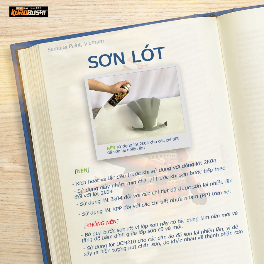 Quy trình sơn cơ bản gồm 4 bước: Lót - Nền - Màu - Phủ Keo bảo vệ, khi bạn áp dụng đủ quy trình này sẽ giúp sản phẩm có màu sắc đẹp và độ bền màu cao. Hướng dẫn cơ bản về sơn xịt Samurai bạn xem trong hình trên giúp shop nhé