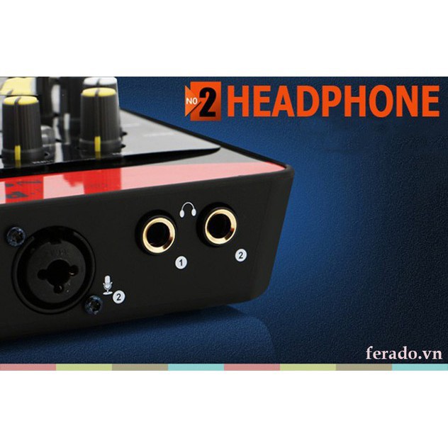 - Hai cổng mic in combo 2 cổng giao tiếp XLR (48V)và 6.3mm (5V) với 2 núm điều chỉnh Gain riêng biệt.