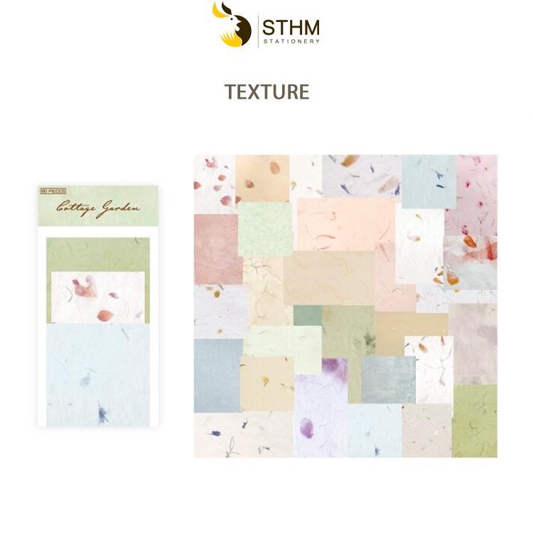 Các mẫu giấy nền bao gồm: + Watercolor - nền loang màu nước với 30 tờ kích thước 11x15cm (tương đương khổ A6) + Handwriting - nền chữ viết tay độc đáo và cực sang - 30 tờ kích thước 11x15cm + Nền Floral - nền hoa, lá dạng pattern - 60 tờ kích thước nhỏ bao gồm 6x6cm - 5.4x9cm - 6x11cm - 5.6x8cm + Nền texture - dạng nền ép hoa cỏ có texture sợi - - 60 tờ kích thước nhỏ bao gồm 6x6cm - 5.4x9cm - 6x11cm - 5.6x8cm