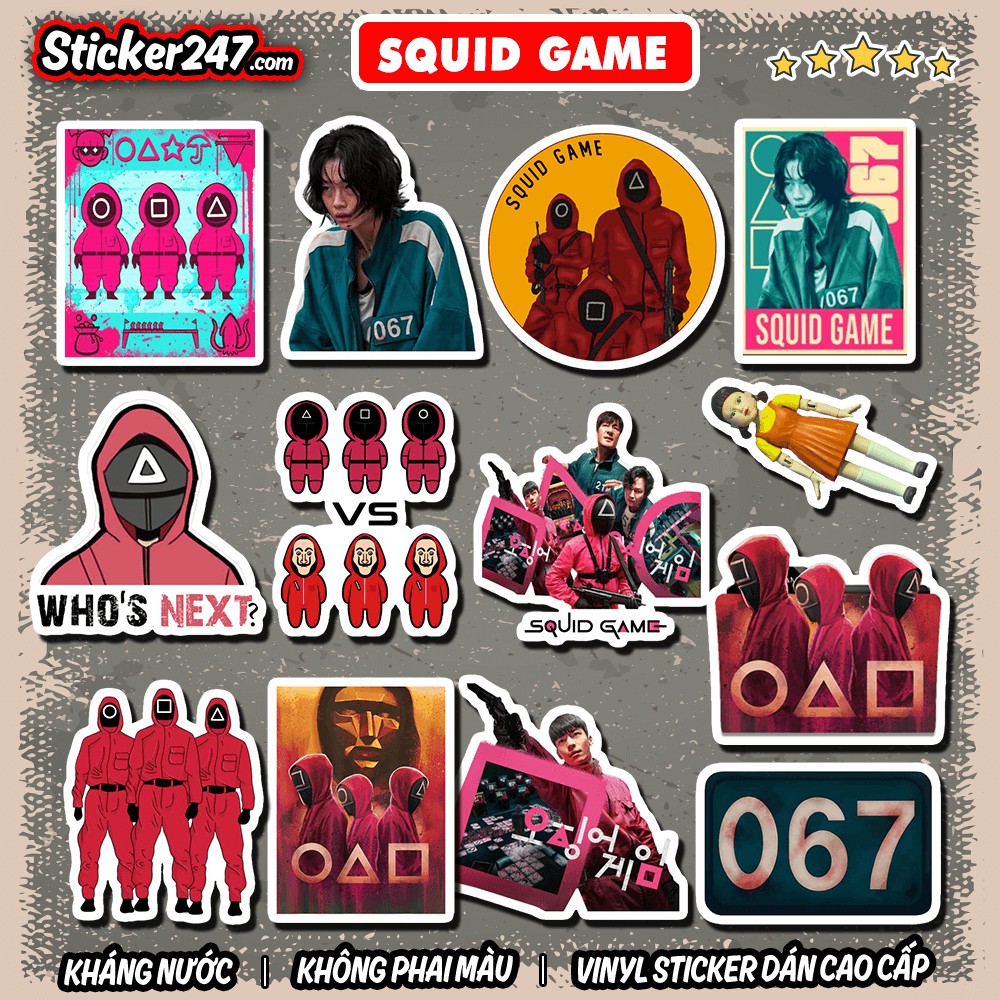 Sticker SQUID GAME Trò Chơi Con Mực 𝑭𝒓𝒆𝒆𝒔𝒉𝒊𝒑 chống nước, decal hình dán mũ bảo hiểm, laptop, ipad, vali, đàn, decor xe