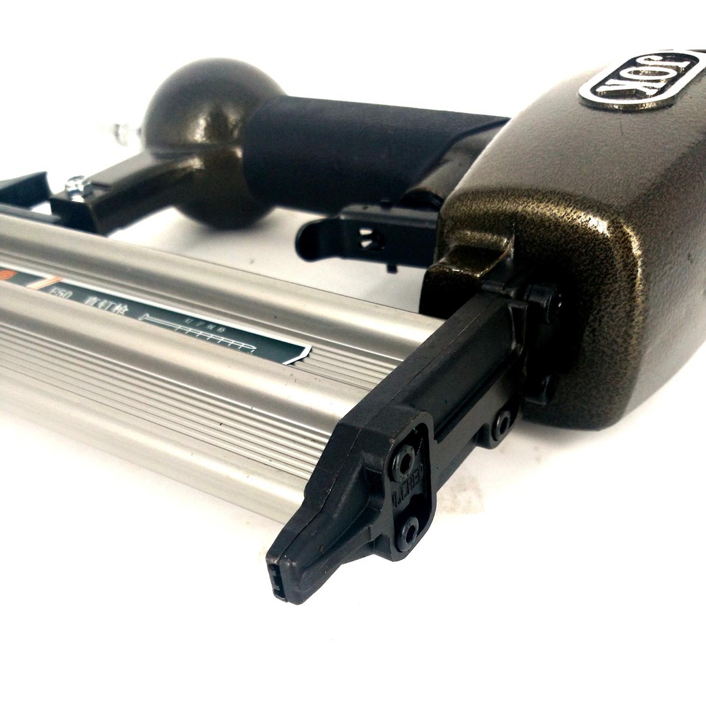 Súng bắn đinh cầm tay F50 là 1 phát kiến quan trọng trong sản xuất và đời sống. Nhờ có súng bắn đinh hơi, con người không còn tốn nhiều thời gian và công sức để gõ từng cây đinh như xưa mà có thể bắn ra hàng loạt đinh trong thời gian chớp mắt, tiết kiệm chi phí, nâng cao hiệu quả công việc lên gấp bội lần. Ưu điểm: Giá thành rẻ Khối lượng nhẹ, máy nhỏ gọn, tiện cho di chuyển và thao tác Tay cầm và báng súng chắc chắn Có điều chỉnh được độ sâu của đinh bắn Chịu được tải hoạt động liên tục Khối lượng 1.5kg