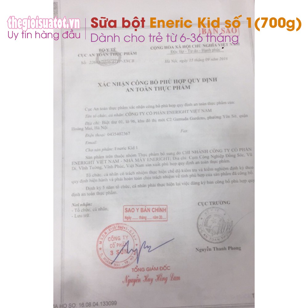 Sữa Eneric Kid dinh dưỡng chuyên biệt cho trẻ biếng ăn và suy dinh dưỡng từ 6-36 tháng được chứng nhận bởi Bộ Y Tế Việt Nam Eneric kid 1 dinh dưỡng chuyên biệt cho trẻ biếng ăn và suy dinh dưỡng, sản phẩm của công ty Eneright Nutrition với nguồn nguyên liệu sữa bột được nhập khẩu từ Newzea Land. Sữa Eneric Kid 1 thực phẩm dinh dưỡng dễ hấp thu, cơ cấu dinh dưỡng hợp lý, kết hợp trong 1 sp dinh dưỡng thơm ngon, giúp trẻ hứng thú mỗi khi sử dụng và có một nguồn dinh dưỡng bổ sung cao. Sữa Eneric Kid đậm độ dinh dưỡng cao, linh động theo nhu cầu và thể trạng từng bé,trong từng giai đoạn giúp cung cấp dinh dưỡng phù hợp,giúp trẻ phục hồi nhanh hơn,tăng trưởng khỏe mạnh hơn. Eneric Kid với 6 công dụng: – Phát triển chiều cao,cân nặng: Canxi, Phospho, Vitamin D3 – Giúp trẻ ăn ngon và hỗ trợ tiêu hóa: Chất xơ FOS,L-Lysine – Thông minh và sáng mắt: Taurine, Choline – Ngủ ngon, giảm quấy khóc: Lacitum – Tăng cường miễn dịch khỏe mạnh: Beta-glucan, Kẽm, Selen, khoáng chất Vitamin A- C- E – Hỗ trợ Não bộ, Thị Giác: DHA/ ARA Đối tượng sử dụng sữa Eneric Kid Sữa Eneric Kid 1 được thiết kế chuyên biệt cho trẻ từ 6 đến 36 tháng, trẻ suy dinh dưỡng thấp còi Hướng dẫn sử dụng * Rửa thật sạch tay và dụng cụ pha chế trước khi pha * Đun sôi dụng cụ pha chế trong 10 phút * Đun sôi nước trong 5 phút và để nguội xuống 40-500C * Cho chính xác lượng nước cần pha vào cốc hoặc bình * Cho vào lượng sữa bột tương ứng và khuấy đều hoặc lắc đều cho đến khi tan hoàn toàn. Cách pha chuẩn: + Pha 4 thìa gạt (40g) với 180ml nước đun sôi để nguội sẽ được một ly khoảng 200ml + Ngày uống 2-3 ly hoặc theo hướng dẫn của bác sĩ. Lưu ý: Bảo quản sữa Digestive nơi khô sạch, thoáng mát, tránh ánh nắng trực tiếp. Lon đã mở phải được đậy kín và sử dụng hết trong vòng 3 tuần. Sữa Nutrient Kid là sản phẩm do CÔNG TY TNHH DINH DƯỠNG THỰC PHẨM ENERIGHT sản xuất và phân phối thực phẩm dinh dưỡng dựa theo công thức hoàn toàn khác biệt từ Singapore (Special Singapore Formula) kết hợp cùng những nguyên liệu thành phần đạt tiêu chuẩn quốc tế nhập khẩu từ Hoa Kỳ, NewZealand, Pháp, Đức …. Eneright tự tin với chất lượng sản phẩm vượt trội kết hợp giữa công nghệ Singapore hiện đại và nguyên liệu tin cậy từ các quốc gia hàng đầu trên thế giới