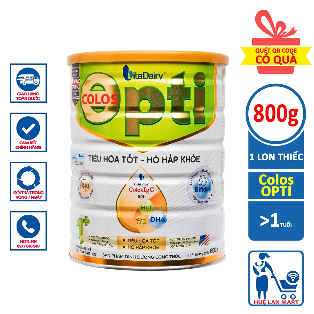 Sữa bột Vitadairy Colos Opti số 1+ hộp 800g tiêu hóa tốt, hô hấp khỏe,phát triển não bộ, chiều cao (1 tuổi trở lên) với công thức dinh dưỡng đầy đủ khoa học bổ sung sữa non ColosIGg 24h độc quyền từ Mỹ, 2'-FL HMO, lợi khuẩn Bifidus và hệ dưỡng chất vượt trội giúp bé tiêu hóa và hấp thu tốt, tăng cường hệ miễn dịch khỏe mạnh và phát triển toàn diện và thể chất và trí tuệ. - TIÊU HÓA TỐT: Lợi khuẩn Bifidus và hệ xơ kép HMO- FOS/Inulin giúp ổn định hệ vi sinh đường ruột, cân bằng tiêu hóa và phòng ngừa táo bón. Lysine, Vitamin nhóm B giúp bé ăn ngon và hấp thu thấp. - HÔ HẤP KHỎE: Sữa non ColosIGg24h cung cấp kháng thể IgG tự nhiên kết hợp 2'FL HMO giúp tăng cường miễn dịch tại đường tiêu hóa, đường hô hấp giúp bé khỏe mạnh và hạn chế ốm vặt. - TĂNG CÂN HỢP LÝ: Dinh dưỡng đầy đủ, khoa học với các dưỡng chất cần thiết đảm bảo cho bé phát triển khỏe mạnh, tăng cân tốt theo đà tăng trưởng chuẩn. - PHÁT TRIỂN NÃO BỘ: với DHA từ tảo biển, Taurin Choline các dưỡng chất cần thiết cho sự hoàn thiện cấu trúc và hoạt động của não bộ, thị giác giúp bé thông minh nhanh nhẹn. - PHÁT TRIỂN CHIỀU CAO: Bổ sung Canxi, Photpho, Vitamin D3 đáp ứng nhu cầu của bé giúp xương chắc khỏe, phát triển chiều cao tốt hơn.