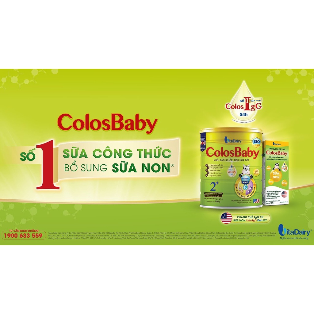 được bổ sung sữa non chất lượng cao ColosIgG 24h hạng A nhập khẩu từ Mỹ được lấy từ bò mẹ trong 24h sau sinh có kháng thể IgG 900mg/100g. Kháng thể IgG có trong thành phần sữa non chính là chìa khoá vàng giúp bé có một hệ miễn dịch khoẻ mạnh. Kháng thể IgG được ví như một liều “vacxin đến từ thiên nhiên”, giúp lấp đầy khoảng trống miễn dịch của bé. Sản phẩm thuộc thương hiệu Vitadairy được sản xuất theo dây chuyền hiện đại theo khuyến nghị của bộ y tế. Vitadairy là đơn vị tiên phong trong việc chủ động tăng cường hệ miễn dịch cho trẻ thông qua sản phẩm dinh dưỡng để con tự tin khám phá thế giới xung quanh, mẹ an tâm. Công dụng của sữa non Colosbaby 1 800g Colosbaby được thiết kế giúp cung cấp năng lượng cao, giàu vitamin và khoáng chất, đặc biệt là bổ sung kháng thể tự nhiên IgG từ sữa non. Sử dụng sữa non Colosbaby hàng ngày sẽ giúp trẻ tăng cường miễn dịch, ngủ ngoan, phòng chóng táo bón, tăng cân, phát triển chiều cao hiệu quả. Tăng cường miễn dịch hiệu quả Colosbaby là một trong số ít các sản phẩm có bổ sung kháng thể IgG 1000mg, đây chính là ưu điểm vượt trội mà các mẹ mong muốn bổ sung cho con. IgG có chắc năng gắn kết với các yếu tố gây bệnh, cô lập và tiêu diệt một cách dễ dàng. Trong đó hàm lượng IgG càng cao thì khả năng phòng chống bệnh dịch càng hiệu quả. Chính vì vậy Colosbaby giúp bổ sung lượng kháng thể cao IgG từ sữa non là cách trực tiếp để cơ thể bé có lượng IgG cao ổn định, luôn sẵn sàng bảo vệ bé khỏi các tác nhân gây bệnh, giúp bé khỏe mạnh và ít ốm vặt. Giúp trẻ ngủ ngon mau lớn Lactium là một trong các dưỡng chất quý hiếm có trong sữa mẹ có tác dụng đem lại cảm giác thoải mái, thư giãn, giúp trẻ ngủ ngon và sâu giấc. Thành phần Lactium được bổ sung vào sữa Colosbaby là dưỡng chất đặc biệt trong quá trình thủy phân casein sữa giúp cơ thể tiêu hóa dễ dàng. Phòng và chống táo bón ở trẻ Chất xơ hòa tan FOS giúp cân bằng hệ vi sinh đường ruột, cho hệ tiêu hóa luôn khỏe mạnh, đồng thời duy trì nhu động ruột, làm mềm phân và ngăn ngừa táo bón cho trẻ. Giúp trẻ tăng cân khỏe mạnh Dinh dưỡng hợp lý, cung cấp đầy đủ chất đạm, chất béo, vitamin và khoáng chất cần thiết cho quá trình phát triển cấu trúc và chức năng của cơ thể giúp bé tăng cân khỏe mạnh. Phát triển chiều cao tối đa Canxi, Magie, Phospho: Tham gia hình thành cấu trúc xương, giúp xương chắc khỏe. Vitamin D3 tăng cường hấp thu và sử dụng Canxi để phát triển chiều dài xương, giúp bé phát triển chiều cao vượt trội.