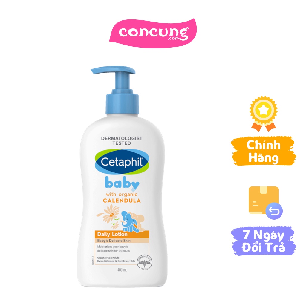 Sữa dưỡng da trẻ em tinh chất hoa cúc Cetaphil được thiết kế đặc biệt có tác dụng làm dịu và nuôi dưỡng làn da của bé, đồng thời dưỡng ẩm và bảo vệ làn da nhạy cảm của em bé khỏi bị khô. Thành phần chiết xuất hoa cúc calendula hữu cơ cùng dầu hạnh nhân ngọt, dầu hướng dương và vitamin E có trong sản phẩm có tác dụng làm mềm và mịn da.Ưu điểm nổi bật . Được làm từ thành phần đã kiểm nghiệm và chứng minh lâm sàng là dịu nhẹ trên da nhạy cảm; . Bổ sung tinh chất cúc vạn thọ hữu cơ, phù hợp với làn da khô của bé;. Giúp cấp ẩm toàn thân và chữa lành vết thương, nhiễm trùng do bị nấm. Hướng dẫn sử dụng. Cho sữa dưỡng ra tay, xoa hai bàn tay vào nhau để làm nóng sản phẩm;. Nhẹ nhàng xoa lên mặt và cơ thể của trẻ;. Nếu bị dính vào mắt thì mau chóng rửa lại với nước sạch. Hướng dẫn bảo quản . Bảo quản nơi khô ráo, thoáng mát;. Tránh để nơi có ánh nắng chiếu trực tiếp. Thành phầnAqua, Sorbitol, Helianthus Annuus Seed Oil, Isopropyl Palmitate, Octyldodecanol, Polyglyceryl-3 Diisostearate, Glycerin, Hexyldecanol, Hexyldecyl Laurate, Prunus Amygdalus Dulcis Oil, Calendula Officinalis Flower Extract, Caprylyl Glycol, Carbomer, Dipropylene Glycol, Disodium Cocoyl Glutamate, Glyceryl Caprylate, Glycine Soja Oil, Heliotropine, Panthenol, Parfum, Propylene Glycol, Sodium Hydroxide, Squalane, Tocopherol