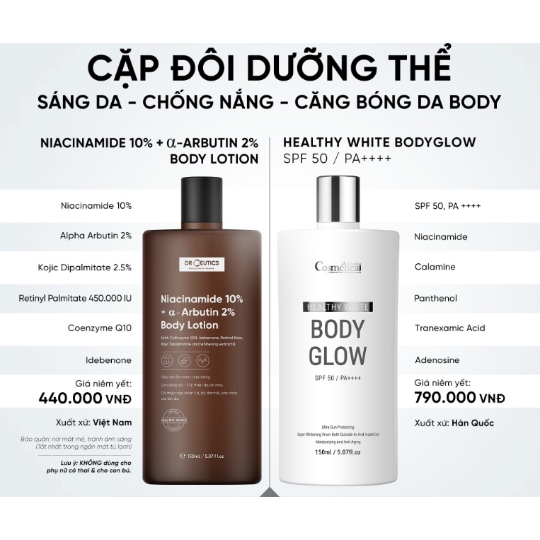 Giới thiệu Sữa dưỡng thể trắng da Drceutics Body Lotion ban đêm, Cosmeheal ban ngày 150ml