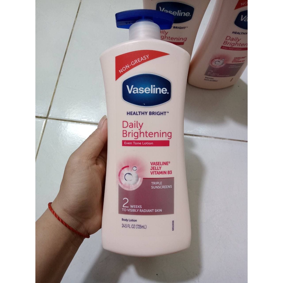 Sữa dưỡng thể vaseline màu hồng heathy white dưỡng ẩm làm sáng và mềm mịn da 725ml India Thành Phần – Công dụng: 1. Vaseline Healthy White (Hồng) - Sữa dưỡng thể Vaseline trắng da tổng hợp nhiều loại Vitamin và độ ẩm. - Vaseline bổ sung 100% chất ẩm và cung cấp chất dinh dưỡng cần thiết như Vitamin A, E, B và khoáng chất. - Chứa những thành phần khoán chất là trắng sáng da toàn diện như huyết thanh chiết xuất từ Yaourt & Vitamin B3. Những dưỡng chất này cung cấp đủ độ ẩm cần thiết cho da sáng khỏe hơn. Và là một hàng rào bảo vệ giúp da chống lại ánh nắng mặt trời hiệu