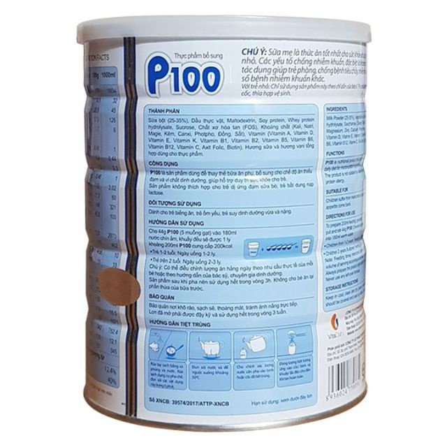 _ Sữa P100 sản phẩm của công ty TNHH dinh dưỡng VITADAIRY với có nguồn nguyên liệu từ USA. Sữa P100 đã được chứng nhận của bộ Y Tế là dòng sữa dành cho trẻ trong giai đoạn ốm và phục hồi sau ốm, suy dinh dưỡng thấp còi. Sản phẩm được các bác sĩ khuyên dùng cho các bé từ 6 tháng đến 10 tuổi, nhằm hồi phục dinh dưỡng, cho bé cần thêm năng lượng, chất đạm vào cơ thể. Vì vậy mà cứ 10 trẻ bị bệnh đến viện dinh dưỡng khám sẽ có 8 trẻ được bác sĩ ở đây khuyên dùng. _ Trước khi pha sữa mẹ cần rửa sạch tay và dụng cụ pha, tiệt trùng dụng cụ pha trong nước sôi 5 phút. Sử dụng nước đun sôi để nguội xuống khoảng 40-50 độ C pha sữa. Cho 44g sữa P100 (5 muỗng gạt) vào 180ml nước chín ấm, khuấy đều sẽ được khoảng 200ml sữa P100 cung cấp khoảng 200kcal.