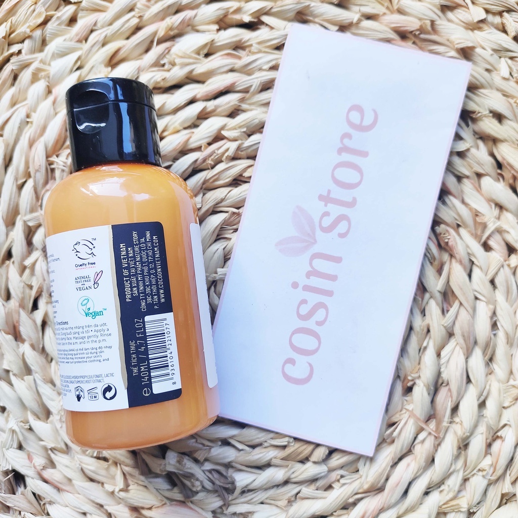 Thông tin sản phẩm: - Thương Hiệu: Cocoon - Xuất Xứ: Việt Nam - Loại: Mỹ Phẩm - Thành phần chính: Chiết xuất nghệ, cà rốt và AHA - Thể Tích: 140ml - Hạn Sử Dụng: Xem tại phần ngày hết hạn - Quy cách: Dạng chai