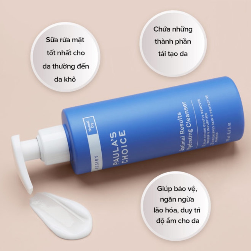 Sữa rửa mặt dưỡng ẩm hiệu quả tối ưu Paula's Choice Resist Optimal Results Hydrating Cleanser 190ml * Xuất xứ: Sản xuất tại Mỹ Sữa rửa mặt dưỡng ẩm chống lão hóa RESIST Optimal Results Hydrating Cleanser giúp tăng cường dưỡng chất trên bề mặt da, nhẹ nhàng tẩy sạch lớp trang điểm mà không làm mất đi độ ẩm tự nhiên hay khiến cho da ngứa rát. Bạn lo ngại những dòng rửa mặt sẽ làm khô căng làn da khô nhạy cảm của bạn? Bạn đang tìm kiếm một sản phẩm rửa mặt thích hợp với da khô lão hoá? Sữa rửa mặt dưỡng ẩm chống lão hóa RESIST Optimal Results Hydrating Cleanser với thành phần làm sạch dịu nhẹ nhưng hiệu quả, kết hợp với thành phần chống lão hoá và làm dịu da chắc chắn sẽ là sự lựa chọn tốt nhất cho làn da của bạn.