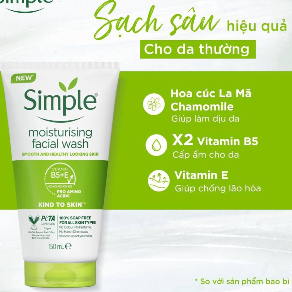 Ưu thế nổi bật: Sữa rửa mặt Simple Moisturising giúp làm sạch sâu da hiệu quả, loại bỏ bã nhờn, bụi bẩn và các tạp chất khác. Công thức chứa X2 Vitamin B5 (so với sản phẩm bao bì cũ) giúp cấp ẩm cho da trông ẩm mượt, không bị khô căng. Chiết xuất hoa Cúc La Mã Chamomile giúp làm dịu da, giảm kích ứng, mẩn đỏ. Bổ sung thành phần Vitamin E giúp ngăn ngừa lão hoá, dưỡng da mịn màng. KHÔNG CHỨA hóa chất gây hại cho da: hương liệu, xà phòng, cồn, dầu khoáng, nhờ đó hạn chế làm da khô - căng rát hay kích ứng.