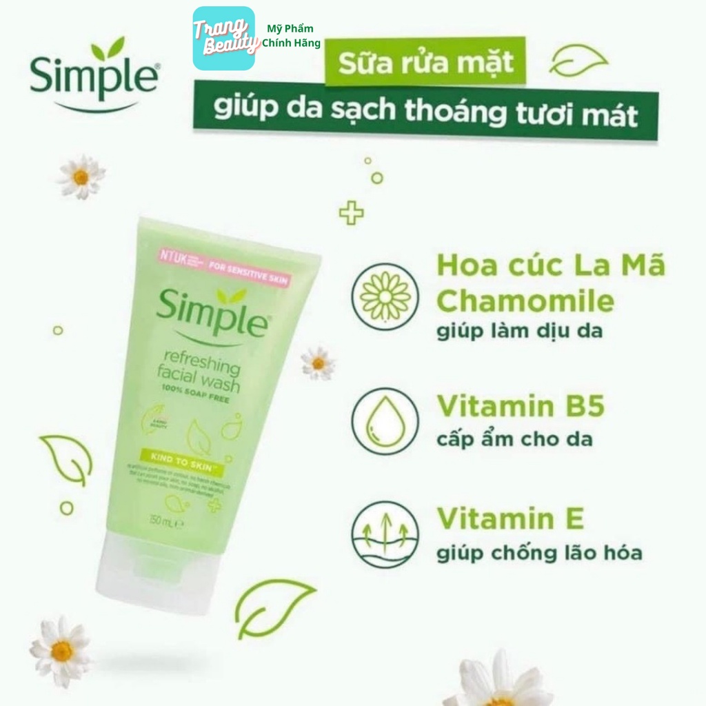 Sữa rửa mặt Simple là sự hòa hợp hoàn hảo giữa các thành phần giúp nhẹ nhàng làm sạch da mà không làm mất đi độ ẩm tự nhiên của da, trả lại làn da mềm mại tươi mát. Sản phẩm không chứa hương liệu, phụ gia không cần thiết và đã được kiểm nghiệm da liễu. Phù hợp với mọi loại da, kể cả da nhạy cảm.