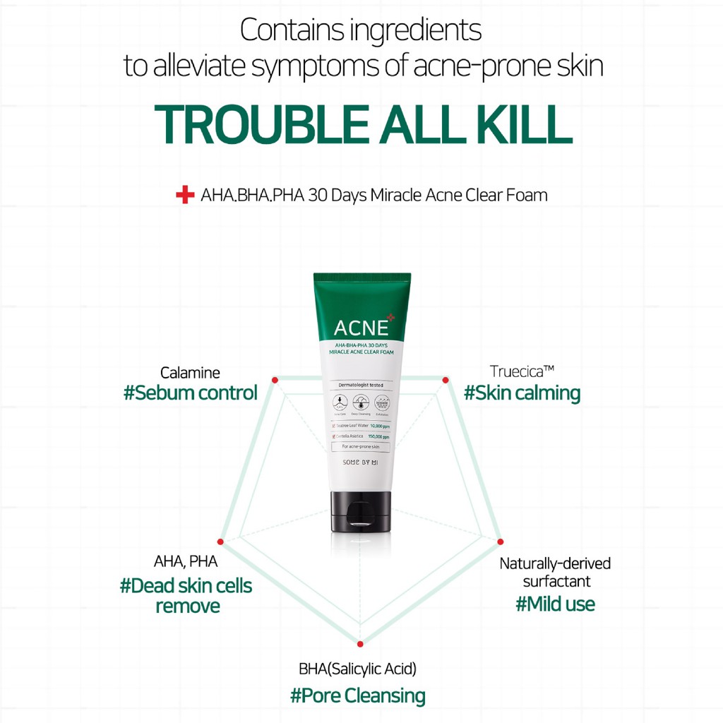 Mụn luôn là một trong những kẻ khó ưa gây mất thẩm mỹ, bạn muốn nhanh nhanh loại bỏ chúng đi. Nhưng việc xử lý mụn cần bạn phải kiên nhẫn cùng một quy trình dưỡng da đúng và nên tìm ra một loại sữa rửa mặt dành riêng cho da mụn là rất quan trọng. Được phát triển với một công thức dịu nhẹ, Some By Mi AHA-BHA-PHA 30 days Miracle Acne Clear Foam bọt rửa mặt 'thần kì' giúp làm dịu da, loại bỏ tình trạng da mụn sưng đỏ, mang lại sự tươi mới cho làn da và ngăn ngừa các nguyên nhân gây mụn.