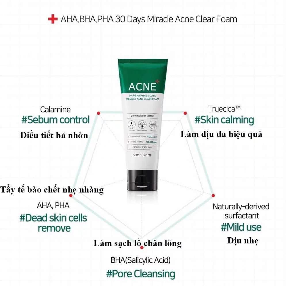 Mụn luôn là một trong những kẻ khó ưa gây mất thẩm mỹ, bạn muốn nhanh nhanh loại bỏ chúng đi. Nhưng việc giảm mụn cần bạn phải kiên nhẫn cùng một quy trình dưỡng da đúng và nên tìm ra một loại sữa rửa mặt dành riêng cho da mụn là rất quan trọng. Được phát triển với một công thức dịu nhẹ, Some By Mi AHA-BHA-PHA 30 days Miracle Acne Clear Foam bọt rửa mặt 'thần kì' giúp làm dịu da, loại bỏ tình trạng da mụn sưng đỏ, mang lại sự tươi mới cho làn da và ngăn ngừa các nguyên nhân gây mụn.