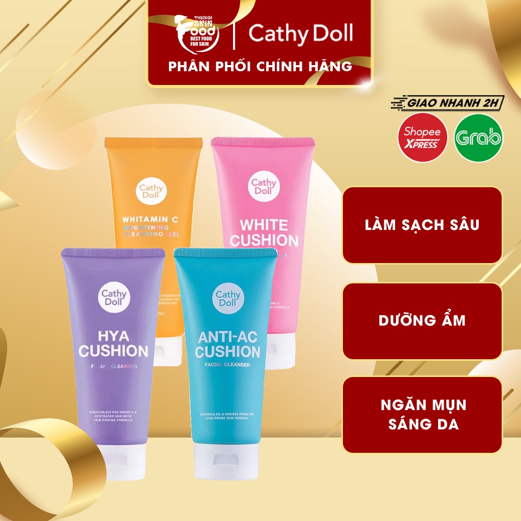 THÔNG TIN CHI TIẾT • Đặc trưng: - Sữa Rửa Mặt Tạo Bọt Giúp Làm Sạch Sâu Cathy Doll Cushion Facial Foam Cleanser hiện nay đã có mặt tại Thế Giới Skinfood. Với 4 loại: 1. Sữa Rửa Mặt Tạo Bọt Giúp Làm Sạch Sâu Cathy Doll Hya Cushion Facial Foam Cleanser 2. Sữa Rửa Mặt Tạo Bọt Giúp Làm Sạch Sâu Cathy Doll Anti-Acne Cushion Facial Foam Cleanser 3. Sữa Rửa Mặt Tạo Bọt Giúp Làm Sạch Sâu Cathy Doll White Cushion Facial Foam Cleanser 4. Gel Rửa Mặt Vitamin C Dưỡng Sáng Da, Mờ Thâm Cathy Doll Whitamin C Brightening Cleansing Gel với thành phần chứa dẫn xuất Vitamin C có khả năng cải thiện sắc tố da, dưỡng sáng, mờ thâm và các thành phần thiên nhiên như Vitamin E, chiết xuất keo ong, dầu dừa, tinh dầu vỏ cam sành... giúp cấp ẩm sâu. Đồng thời gel rửa mặt có độ pH 5.5 dịu nhẹ, không chứa 7 chất kích ứng nên an toàn cho da giúp da sạch sâu, loại bỏ bụi bẩn bả nhờn mang lại làn da mềm mịn, sáng khỏe.