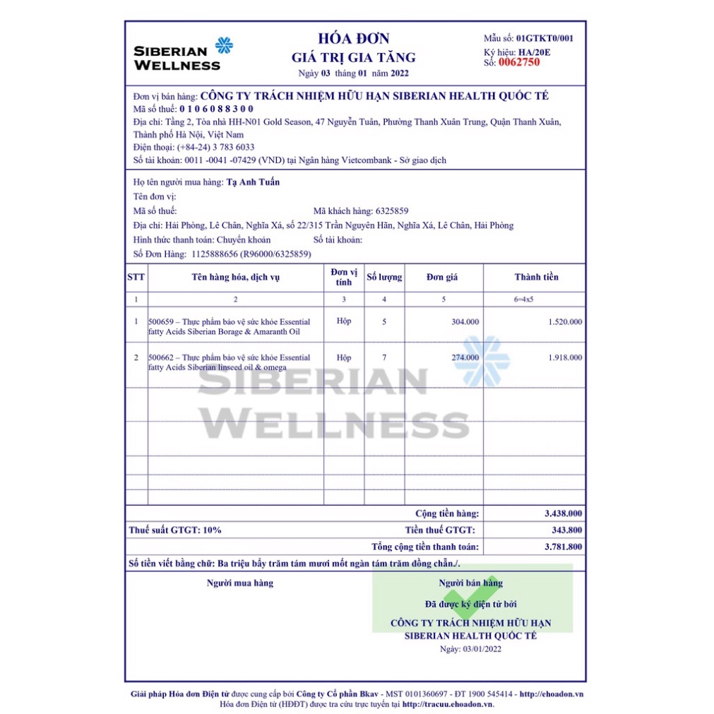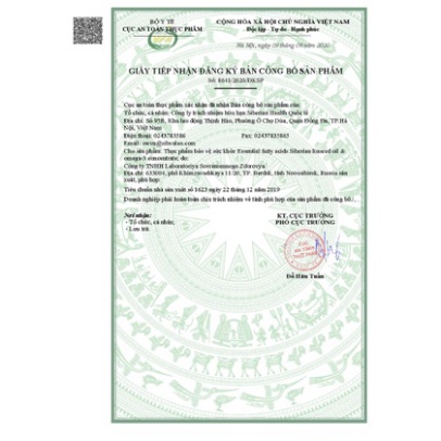Công dụng: Sản phẩm là nguồn bổ sung Omega-3 từ dầu cá biển và vitamin E, hỗ trợ chống oxy hóa. Hỗ trợ sức khỏe tim mạch. Hướng dẫn sử dụng: Sử dụng 2-3 viên 1 ngày sau khi ăn. Đối tượng sử dụng: Người có nhu cầu chống ô xy hóa và bảo vệ tim mạch. Thành phần: Trong 1 viên nang mềm 790 mg có: MEG-3™ (75% Axit béo không bão hòa đa nối đôi omega-3 cô đặc từ dầu cá biển) (500 mg) (trong đó Axit béo không bão hòa đa nối đôi omega-3: 375mg), Dầu lanh (45mg), DL-alfa-tocopherol acetate (5mg) (trong đó Vitamin E hoạt tính: 4,87mg), Vỏ viên nang mềm (galetin, glycerin, nước) (240 mg). Lưu ý: - Không sử dụng cho người có mẫn cảm với bất kỳ thành phần nào của sản phẩm. Bảo quản: Bảo quản nơi khô ráo, thoáng mát, tránh ánh sáng và ở nhiệt độ không quá 20oC. Quy cách bao gói: 30 viên/hộp. Hạn sử dụng: 24 tháng kể từ ngày sản xuất. Xuất xứ: Liên Bang Nga. Chịu trách nhiệm nhập khẩu và phân phối: Công ty TNHH Siberian Health Quốc Tế; Địa chỉ: Tầng 2, tòa nhà HH-N01 Gold Season, 47 Nguyễn Tuân, Phường Thanh Xuân Trung, Quận Thanh Xuân, Thành phố Hà Nội.