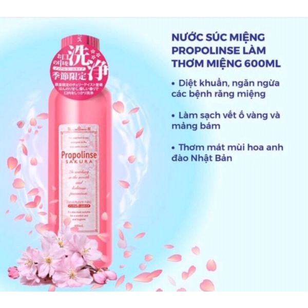 Nước súc miệng Propolinse Sakura màu hồng: Được bổ xung thêm chiết xuất hương hoa anh đào mang cả hương vị Nhật vào hơi thở của b với hương hoa dễ chịu, ngăn ngừa hôi miệng