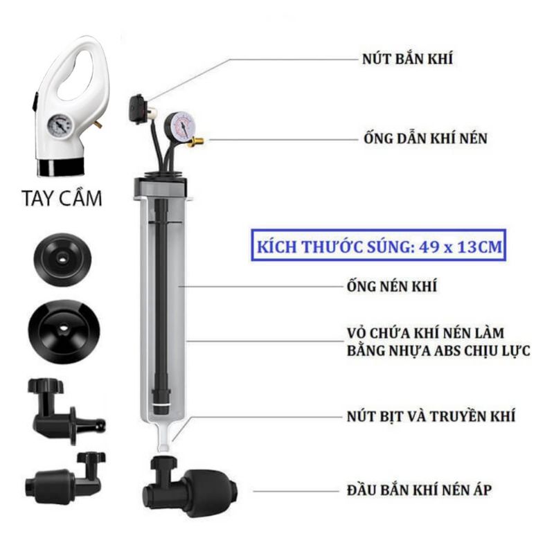 - Súng tạo ra áp lực thông tắc bồn cầu nhà vệ sinh, thông tắc bồn rửa bát, thông tắc cống bằng khí nén có thiết kế cao cấp, kiểu dáng nhỏ gọn dễ dàng cầm nắm khi sử dụng…