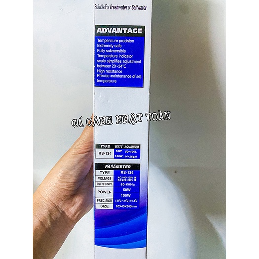 - Máy sưởi bể cá RS là sản phẩm rất được anh em chơi cá ưu chuộng và tin tưởng. Sản phẩm có thiết kế đẹp, chắc chắn, có vỏ bọc nhựa chống bỏng cá. - Máy sưởi có đèn báo khi hoạt động, đèn tự ngắt khi đặt đến ngưỡng cảm biến hoạt động. Quá trình này sẽ diễn ra liên tục và nhiệt độ sẽ được khuếch tán ra toàn bộ bể. - Thông tin sản phẩm: + Hãng sản xuất: RS. + Điện áp: 220-240V; 50-60Hz. + Nhiệt độ: 20-34°C ± 0.5°C. * RS-134 100W: + Công suất: 100W + Phù hợp: 50 - 100L + Kích thước: 80x45x305mm * RS-135 200W: + Công suất: 200W + Phù hợp: 100 - 200L + Kích thước: 80x45x360mm * RS-136 300W: + Công suất: 300W + Phù hợp: 200 - 300L + Kích thước: 80x45x410mm - Lưu ý: + Nên sử dụng sưởi bằng hoặc cao hơn công suất cần thiết để sưởi bền và tiết kiệm năng lượng hơn. + Nên để sưởi ngập toàn bộ trong bể để cảm biến hoạt động tốt. + Khi thay nước cần ngắt điện sưởi trước 5 - 10 phút. 🏠CÁ CẢNH NHẬT TOÀN: 32 Phan Bội Châu - P1 - Thị Xã Gò Công - Tiền Giang (đối diện cầm đồ Kim Lan, gần tiệm vàng Tri Ân) ☎️0977022281