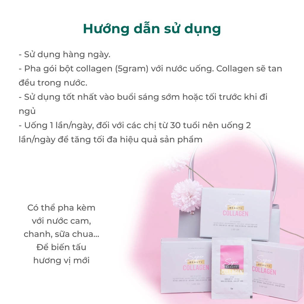 🌺 Hướng dẫn sử dụng: - Sử dụng hàng ngày. - Pha gói bột collagen (5gram) với nước uống. Collagen sẽ tan đều trong nước. - Sử dụng tốt nhất vào buổi sáng sớm hoặc tối trước khi đi ngủ - Có thể pha kèm với nước cam, chanh, sữa chua… - Uống 1 lần/ngày, đối với các chị từ 30 tuổi nên uống 2 lần/ngày để tăng tối đa hiệu quả sản phẩm