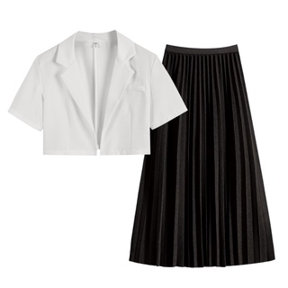 Set Bộ Áo Blazer Cổ Vest Dáng Croptop Phối Chân Váy Midi Dài Xếp Li Thời Trang Sugal AO KHOAC NU 004 + CV NU 014
