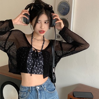 Áo Croptop Dệt Kim Tay Dài Phối Lưới Chống Nắng Thời Trang Cho Nữ