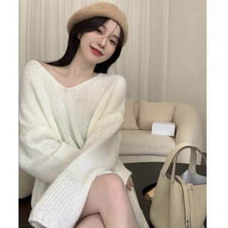 Áo Len Tay Dài Cổ Chữ V Dáng Rộng Xẻ Tà Màu Trơn Thời Trang Mới