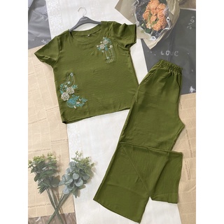 BỘ ĐŨI THÊU TRUNG NIÊN XANH RÊU- MẶC Ở NHÀ CHO BÀ, CHO MẸ-ỐNG RỘNG, QUẦN DÀI- Size 45-75kg