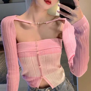 Áo Kiểu Hàn Quốc Dáng Rộng Tay Dài Cổ Tròn Hở Vai Đính Ngọc Trai Phối Dây Xích Thiết Kế Gợi Cảm
