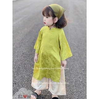 Áo dài cách tân bé gái cổ trụ vân hoa lá siêu xinh cho bé 1-8 Tuổi (Gồm Áo dài, quần, khăn, vòng ngọc)