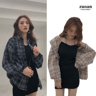 SUXI Áo khoác sơ mi caro / Đầm hai dây phong cách Hàn Quốc thời trang cho nữ