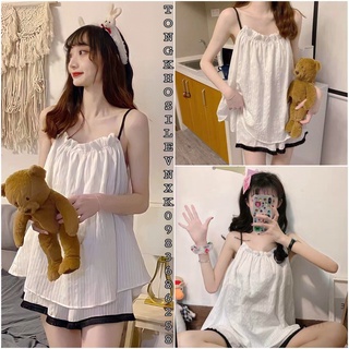 Set 2 Dây Trắng Đũi Nhăn + Quần Đùi Viền Đen Bộ ngủ quần voan ống rộng, áo thun lụa mát mặc ở nhà bánh bèo Ulzzang