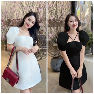 ĐẦM CỔ VUÔNG TAY PHỒNG DÂY NGỰC CHÉO TRẮNG - ĐEN