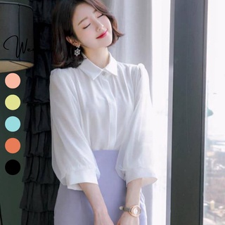Áo Sơ Mi Công Sở Co Giãn Tay Xếp Nếp Màu Sắc Trơn Dành Cho Nữ