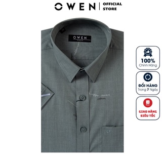 Áo Sơ Mi Nam Ngắn Tay OWEN BA220032NT Somi Công Sở Cao Cấp Màu Rêu In Chữ Trắng Vải Polyester Dáng Suông Tà Bằng Có Túi