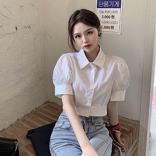 áo sơ mi nữ kiểu croptop cộc tay cổ đức phối nẹp gấu bản to tay phồng
