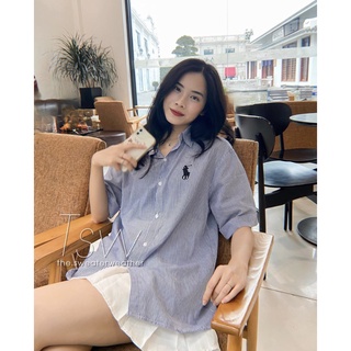 [Ảnh thật/Sẵn] Áo sơ mi kẻ sọc thêu logo ngựa ngắn tay