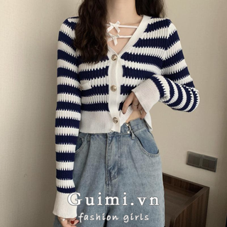 ZHELIHANGFEI Áo Khoác Cardigan Dệt Kim Tay Dài Cổ Chữ V Lưng Cao Họa Tiết Kẻ Sọc Thời Trang