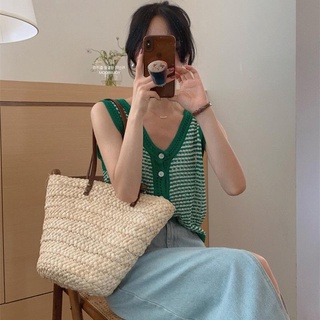 Áo Hai Dây Dệt Kim Cổ Chữ V Dáng Ôm Hoa Văn Kẻ Sọc Thời Trang Dành Cho Nữ