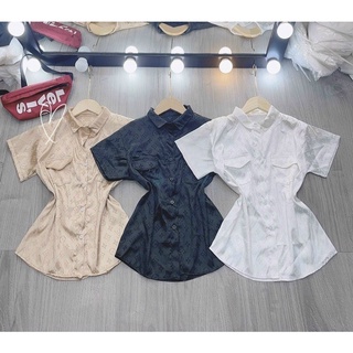 Áo kiễu nữ sơ mi họa tiết chữ LV tay ngắn gài nút hot