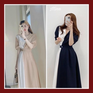 Váy thiết kế phối hai màu đai eo tay bồng dáng dài tiểu thư tôn dáng