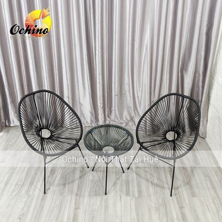 Bộ bàn ghế ban công ngoài trời gồm bàn cafe và 2 ghế mây nhựa khung kim loại trang trí sang trọng (Có Sẵn)