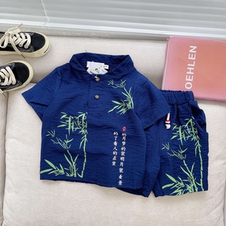 Bộ đồ bé trai cộc tay vải đũi in hình cây tre quần đùi cho trẻ mặc đi chơi SUMO KIDS Quần áo trẻ em
