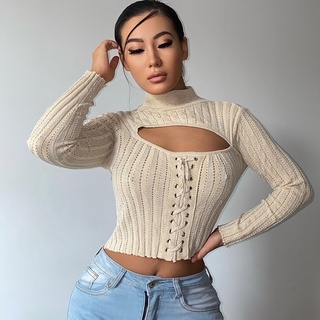 Áo Thun Đan Len Cổ Cao Có Dây Buộc Thiết Kế Mới Cho Nữ