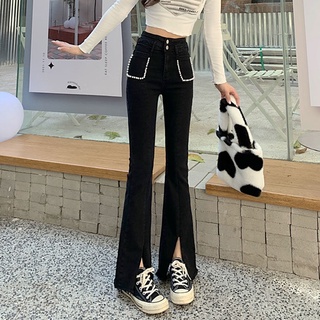 Jiashucheng Quần Jean Dài Lưng Cao Ống Loe Xẻ Tà Màu Đen Thời Trang Xuân Thu Cá Tính Cho Nữ