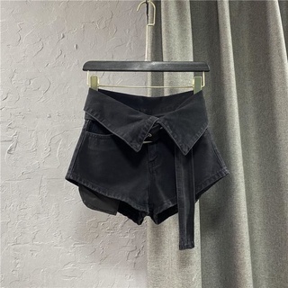 Jiashucheng Influencer Quần Short Denim Đen Dáng Chữ A Lưng Cao Ống Rộng Lệch Tà Thời Trang Xuân Hè 2023