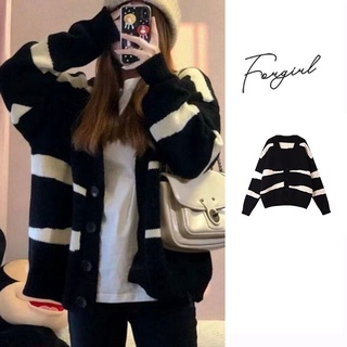 Áo khoác len cardigan Forgirl phối kẻ sọc ngang lớn phối cúc