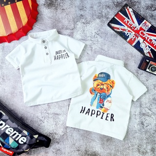 Áo thun cotton trắng cổ bẻ in chú gấu hạnh phúc cho con trai