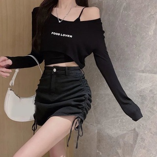 SET ÁO ỐNG ĐEN XẺ TÀ CHÉO DÂY RÚT NGỰC + CHÂN VÁY JEAN